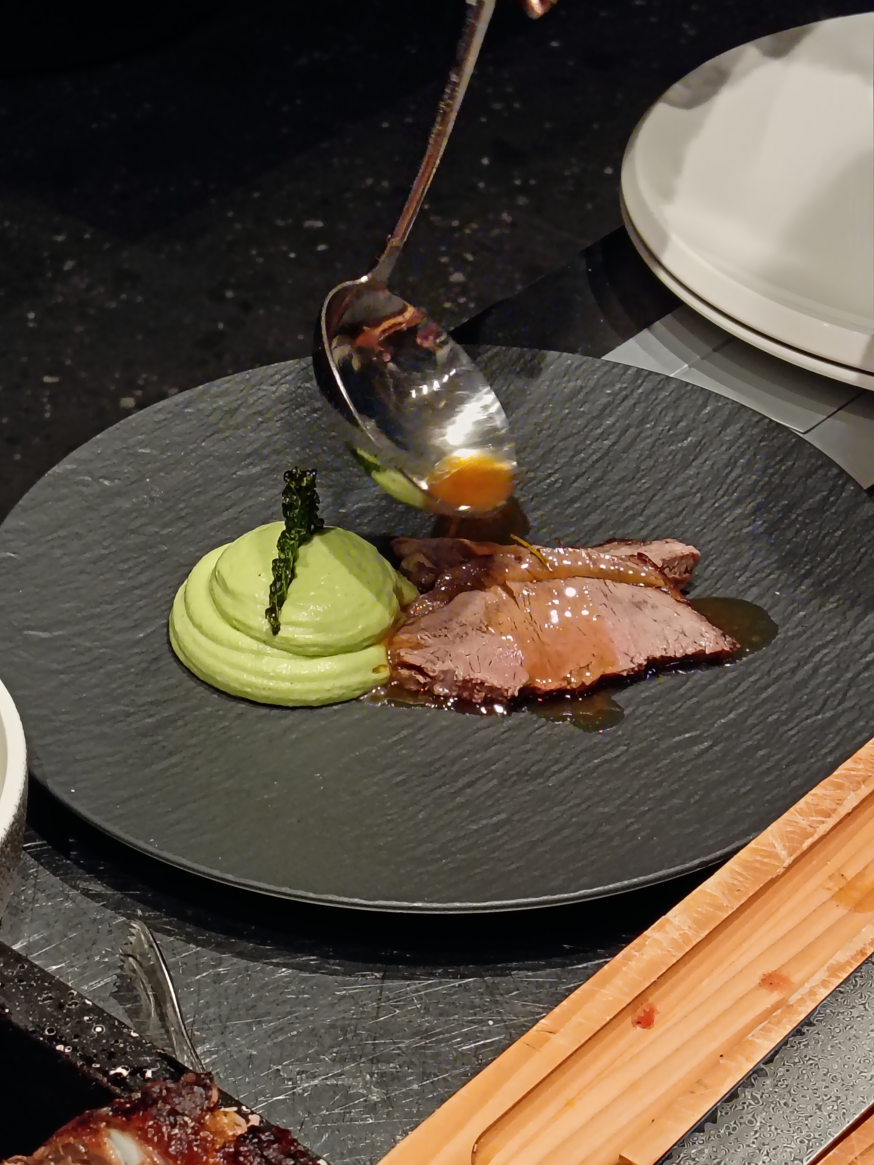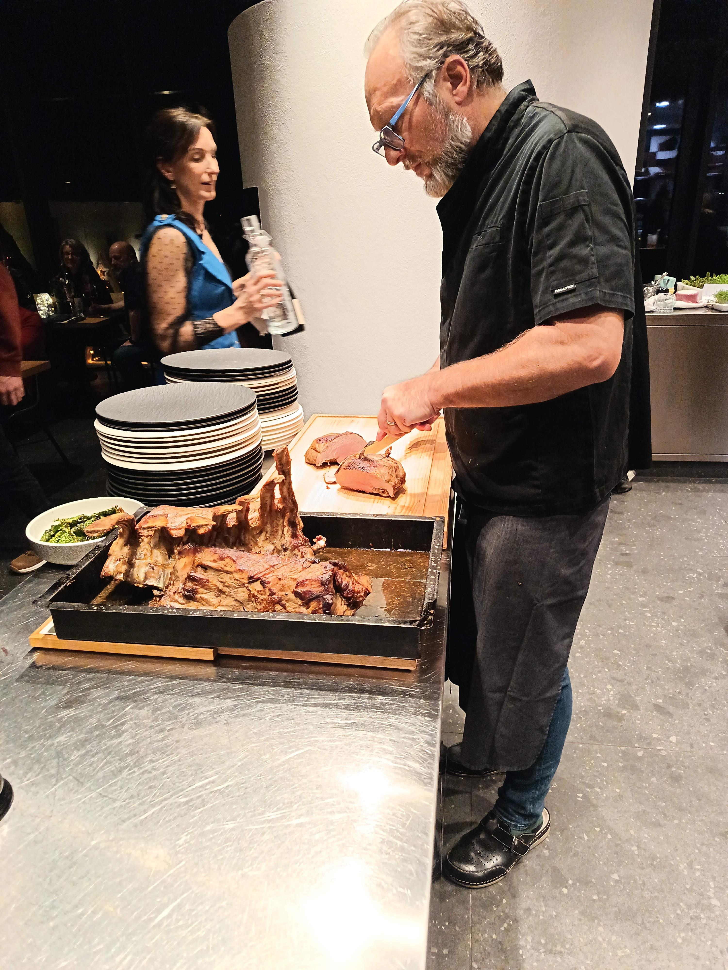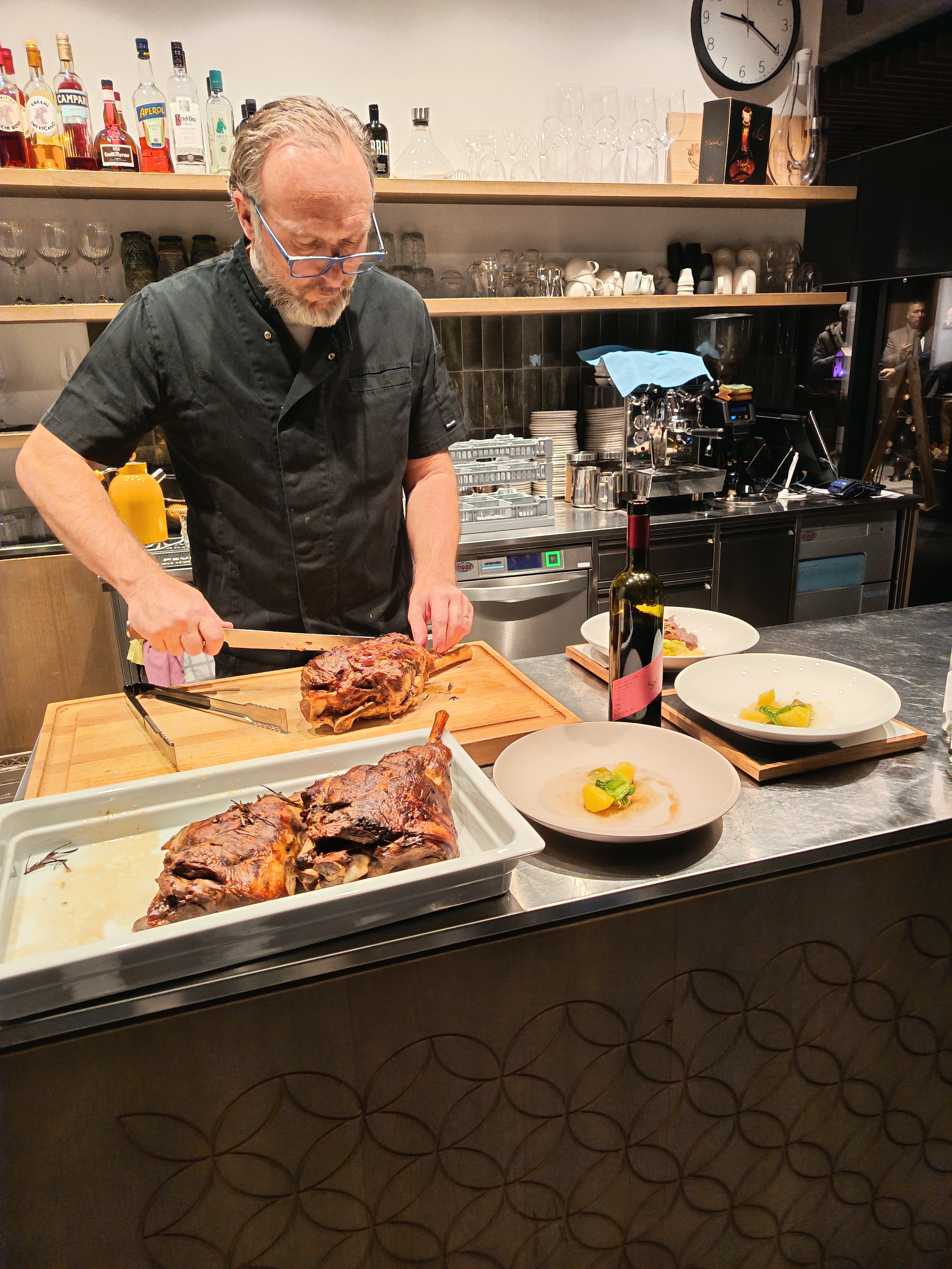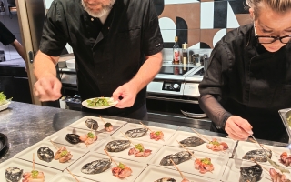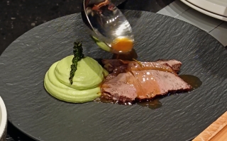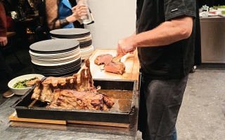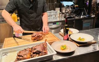 La serata è iniziata nella nostra galleria, dove abbiamo accolto gli ospiti in un’atmosfera rilassata con un saluto di benvenuto e la prima portata. Il momento centrale è stato rappresentato da un menu accuratamente studiato da Robert Čebokelj – proprietario dell’hotel e chef principale – insieme a Josipa Mačinković. In un’elegante dimostrazione culinaria, hanno affettato e servito davanti agli ospiti la coscia d’agnello e il lombo di vitello.
